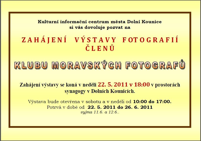v neděli 22.5.2011 budeme instalovat výstavu v Dolních Kounicích od 14 hodin a v 18 bude oslavná vernisáž. Pozvánka je ke shlédnutí zde.