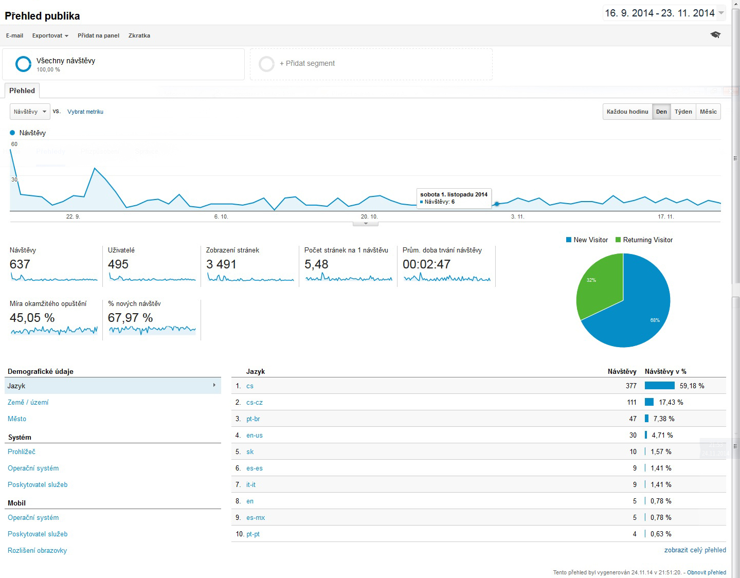Tady je informace o návštěvnosti stránek za období 15.9.2014-23.11.2014.