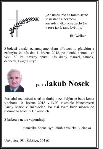 - Bohužel jedna špatná zpráva dne 1.3.2018 nás opustil dlouholetý člen pan Jakub NOSEK. Soustrast jsem vyjádřil manželce za Vás všechny. Pohřeb je dne 10.3.2018 v 13:00 hod. v Unkovicích. Odkaz na stažení parte je zde. Bohužel takto, protože newsletter mně jinou formu neumožňuje.